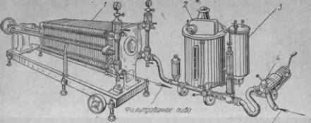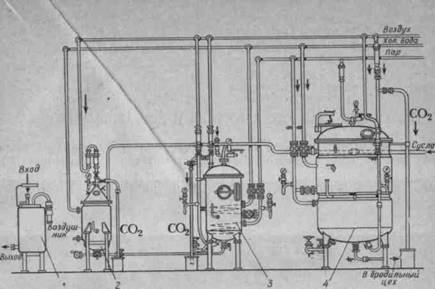 Установка (рис. 51) состоит из колбы 1 для выращивания чистой культуры дрожжей, аппарата 4 для предварительного брожения, цилиндра 2 для размножения чистой культуры дрожжей и стерилизатора 3.