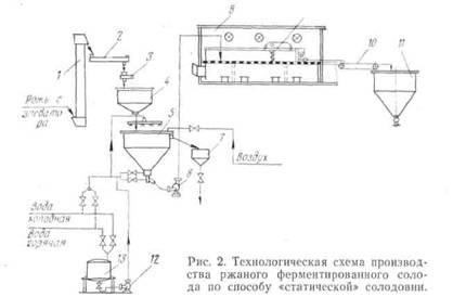 Отсортированную рожь норией 1 и шнековым транспортером 2 подают на автоматические весы 3, Отвешенное количество ржи 9 с весов поступает в накопительный бункер 4, а из него — в моечно-замочный чан 5. Во время мойки в моечно-замочный чан постоянно подают воду. Зерно при мойке перемешивают воздухом, при этом неполноценное зерно всплывает и через приемное устройство перемещается в бункер для сплава зерна 7. По окончании мойки зерно дезинфицируют. Дезинфектант готовят в сборнике 13, откуда его перекачивает насосом 12 в моечно-замочный чан 5. Замоченное зерно насосом 6 перекачивают на ращение, томление и сушку в солодорастильный ящик 8. Ворошение солода в процессе ращения и сушки, а также выгрузку готового сухого солода производят с помощью штопорного ворошителя 9, снабженного приспособлением для выгрузки солода. Затем солод транспортером 10 направляется в бункер 11 для хранения.
