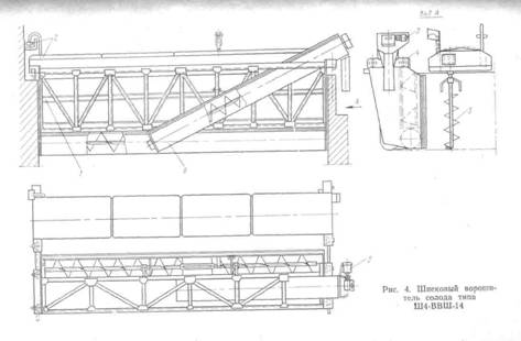 В конце ящика конечный выключатель упирается в ограничитель, закрепленный на швеллере, размыкает цепь и ворошитель останавливается. Число ворошений выбирают в соответствии с технологическими требованиями.