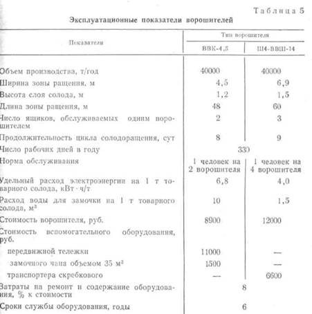 В качестве базового варианта при расчете экономического эффекта принят ворошитель солода типа ВВК-4,5 с удлинителем переброса. Замочка ячменя проводится классическим способом. Каждый ворошитель такого типа работает с передвижной тележкой и обслуживает при этом 2 ящика.