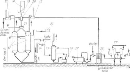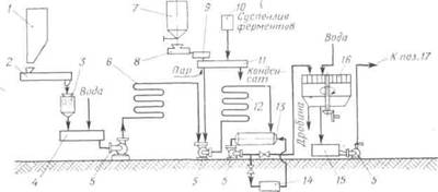 Установка работает следующим образом. Солод из бункера 1 дозатором 2 передается на шестивальцовую дробилку 3, откуда он поступает в предзаторник 4 непрерывного действия, где смешивается с водой, имеющей температуру 47°С, в соотношении 1 : 3, а затем, пройдя трубчатый осахариватель первой ступени 6, где происходит расщепление белков, насосом 5 передается во второй осахариватель 12, куда одновременно поступает затор из несоложеных материалов. Для приготовления последнего несоложеные материалы из бункера 7 дозатором 8 направляются на мельничный стан 9, а из него поступают в развариватель 11, в который из бака 10 вводится суспензия ферментов для клейстеризации крахмала. Здесь помол несоложеных материалов смешивается с водой и кипятится. Смесь двух заторов в осахаривателе второй ступени доводится до температуры 62°С. Из этого осахаривателя затор передается в барабанный осахариватель 13, где температура смеси доводится до 75°С. Затем часть затора насосом подается в непрерывно действующий варочный аппарат 14, где затор кипятится, а затем вновь смешивается с основным затором во вращающемся осахаривателе 13. Осахаренный затор насосом перекачивается в ротационный фильтрационный аппарат 16, представляющий собой вращающийся барабан с отдельными сегментами. По мере передвижения ситчатых сегментов вокруг центральной оси за 3,5 ч затор в них отстаивается, сусло стекает, дробина промывается и выбрасывается через откидное днище. В фильтре воспроизводится процесс фильтрации аналогично работе обычного фильтрационного аппарата.