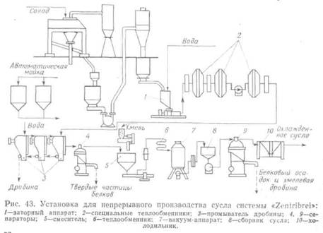 Для приготовления сусла солод подвергают подработке, взвешиванию и измельчению на молотковой дробилке. Измельченный солод непрерывно подается в заторный аппарат, где смешивается с водой при температуре 35°С. Полученный затор нагревают до 50°С в непрерывно действующем теплообменнике, а затем направляют во второй теплообменник — осахариватель, где выдерживают при температуре 50Х заданное время. После этого температуру затора доводят до 70°С, выдерживают затор при этой температуре и передают в третий спиральный теплообменник, где он нагревается до 73°С. На этом процесс осахаривания заканчивается, и затор поступает в аппарат с мешалкой, где происходит полное осахаривание. Из этого аппарата затор непрерывно определенными дозами передается в аппарат для отделения сусла и промывания дробины. После отделения сусла дробину промывают горячей водой, после чего содержание экстракта в ней не превышает 0,5%. Затем дробину направляют на сушку, а промывную воду из третьего аппарата направляют во второй, а из второго — в первый. Такой способ промывки позволяет на выходе из первого аппарата получить промывные воды с высоким содержанием экстракта.