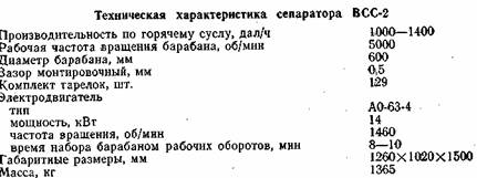 Указанные сепараторы используют для отделения сусла из тарелочного отстоя и для сепарирования молодого пива. Сепараторы хорошо герметизированы, что исключает инфицирование сусла в процессе осветления. Образующийся осадок удаляется из сепаратора на ходу при избыточном давлении 0,8 МПа. Осветленное сусло из сепаратора удаляется с помощью насоса. В остальном устройство сепараторов аналогично сепаратору ВСС-2.