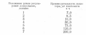 Зависимость производительности дозатора от положения ручки регулирования дозы диатомита следующая: