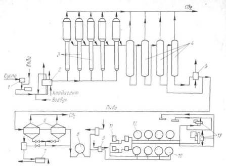 Поднимается вверх, смешиваясь с хлопьевидными дрожжами, находящимися во взвешенном состоянии в виде суспензии. В верхней расширенной части башни зеленое пиво частично отделяется от дрожжей, которые стекают обратно в активную зону брожения и направляются в дрожжевой сепаратор, расположенный в верхней части башенного бродильного аппарата. Тепло, выделяющееся при брожении, удаляется с помощью хладагента, который вводят в рубашку бродильного аппарата. Внутри башни устроены перфорированные перегородки, способствующие перемешиванию сусла и поддерживающие дрожжи во взвешенном состоянии. Молодое пиво выходящее из сепаратора, охлаждается и направляется на батарею вертикальных конденсаторов 4 для дображивания. Пройдя последовательно всю батарею, пиво поступает на холодильник 5 а затем направляется в конический сосуд 6 для осаждения дрожжей. Дрожжи из осадителя отводятся в его нижней части и поступают в пресс 7, а пиво непрерывно поступает в танк дображивания 8, откуда передается в сатуратор 9 для дополнительного насыщения С02. Из сатуратора пиво направляется в танки нефильтрованного пива. Затем пиво фильтруют на намывном фильтре 11, охлаждают и передают в танки 12, где его выдерживают под давлением С02. Перед розливом пиво вторично фильтруют, передают на пастеризатор 13, охлаждают и направляют на розлив.