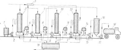 Основные узлы установки: четырехкорпусный выпарной аппарат, теплообменник, термокомпрессор, насосы, сепараторы к промежуточный сборник. Сусло с долей сухих веществ 12% мае. подается из хранилища в промежуточный сборник /, откуда центробежным насосом 2 перекачивается в первый корпус выпарного аппарата 3. Выходящая из него смесь жидкости и пара поступает на сепаратор 4, разделяющий жидкость и пар, после чего жидкость насосом 6 подается во второй корпус 7 выпарного аппарата, а пар разделяется на два потока. Один поток, пройдя через термокомпрессор 5, поступает в паровую магистраль второго корпуса. Сепаратор 8 разделяет жидкость и пар, выходящие из второго корпуса. Жидкость насосом 9 подается в третий корпус 10, который обогревается паром, отделенным сепаратором 8. Выходящая из третьего корпуса смесь жидкости и пара разделяется сепаратором 11, после чего часть жидкости насосом 12 перекачивается в последний корпус 13, обогреваемый паром из термокомпрессора, а остальная жидкость возвращается в третий корпус, пополняя поступающий сюда поток жидкости. Пар, отделенный сепаратором 11, имеет слишком низкую температуру для дальнейшего использования и поступает в теплообменник 19 для конденсации. Концентрированное сусло после отделения от него пара сепаратором 14 перекачивается насосом 15 в сборный танк 16, откуда насосом 17 передается в транспортный контейнер 18.