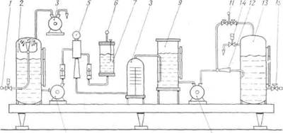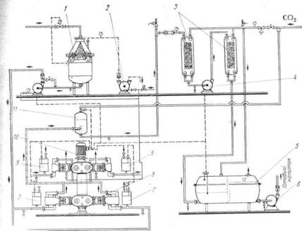 1 — Вакуум-насос; 2—деаэратор; 3—насос для деаэрированной воды; 4—стеклянный сосуд для деаэрированной воды с поплавковым регулятором; 5—стеклянный сосуд для сиропа с поплавковым регулятором; 6—смеситель; 7—насос для напитка; 8—первая ступень карбонизатора; 9—насос; 10—вторая ступень карбонизатора; 11—насос.