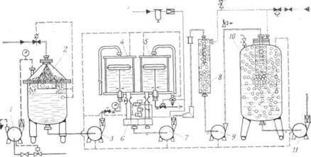 /—деаэратор; 2—вакуум-насос; 3—пластинчатые карбонизаторы; 4—насос; 5—сборник газированного напитка; б—насос для напитка; 7—сборник деаэрированной воды; 8—насос-дозатор деаэрированной воды; 9—сборники основ напитка; 10—насос основ напитка; 11—сборник-смеситель напитка.