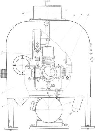 Установка (рис. 89) смонтирована на сварной трубчатой раме 1, на которой размещается резервуар 4 для раствора сульфата серебра, имеющий смотровую щель 5, дозирующее устройстве/ 3, пульт управления 8 и контрольно-смесительное устройство л, а также запорный вентиль и водомер. В нижней части установки, под рамой, на фундаментной плите 10 размещен насос с электродвигателем 9. Все узлы установки закрыты кожухом 2. Расходный резервуар для сульфата серебра выполнен из органического стекла, окрашенного светонепроницаемой краской, что предупреждает выпадение серебра в осадок под действием света. Резервуар снабжен крышкой и воздушной трубкой, сообщающей его с атмосферой. Вместимость расходного резервуара 11 л, что позволяет залить в него запас раствора сульфата серебра, достаточный для двух смен работы. В состав дозирующего устройства входит напорный резервуар 6 вместимостью 0,8 л, который снабжен поплавковым клапаном и переливной трубкой для поддержания постоянного уровня жидкости.