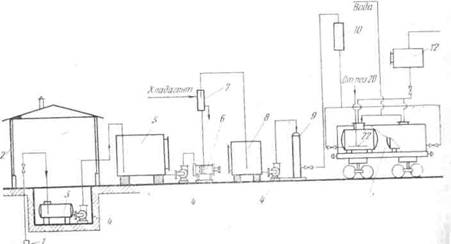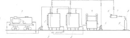 Рис. 95. Технологическая схема наполнения железнодорожных цистерн минеральной водой.