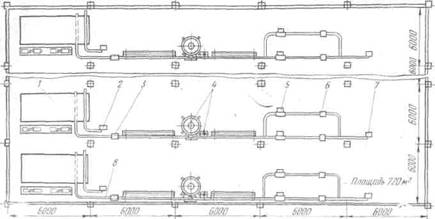 Для увеличения мощности цеха розлива пива за счет замены линий производительностью 6000 бутылок в 1 ч линиями производительностью 12 000 бутылок в 1 ч с размещением их на тех же площадях рекомендуется компоновка, осуществленная на Воронежском пивзаводе (рис. 97), где четыре линии розлива производительностью по 6000 бутылок в 1 ч заменены четырьмя линиями производительностью по 12 000 бутылок в 1 ч.