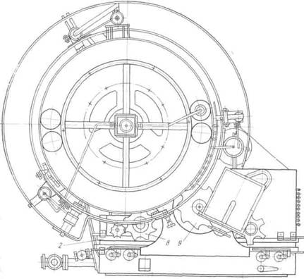 Автомат (рис. 98) состоит из основания 1, на котором смонтированы разливочная и укупорочная машины. Бутылка подается пластинчатым транспортером 2 к вводной звездочке 8, которая устанавливает ее к наливателю 3. После того как через систему клапанов выровняется давление в бутылке и кольцевом резервуаре с напитком 4, происходит заполнение бутылки напитком.