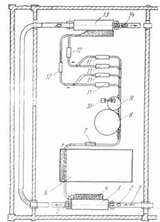 /—ленточный транспортер; 2—ящики с порожними бутылками; 3—автомат для выемки бутылок из ящиков; 4—накопительный стол; 5—пустые ящики; 6— бутылкомоечная машина; 7—смотровой экран; 8—разливочная машина; 9—укупорочная машина; 10—устройство для подачи кронен-пробки; 11—инспекционный автомат; 12—этикетировочный автомат; 13—автомат для укладки бутылок в ящики; 14—ящики с готовой продукцией.